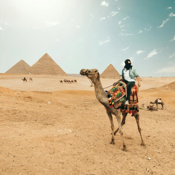 Experience the timeless desert around the pyramids on horseback or camelback. A peaceful ride perfect for photos and quiet moments.